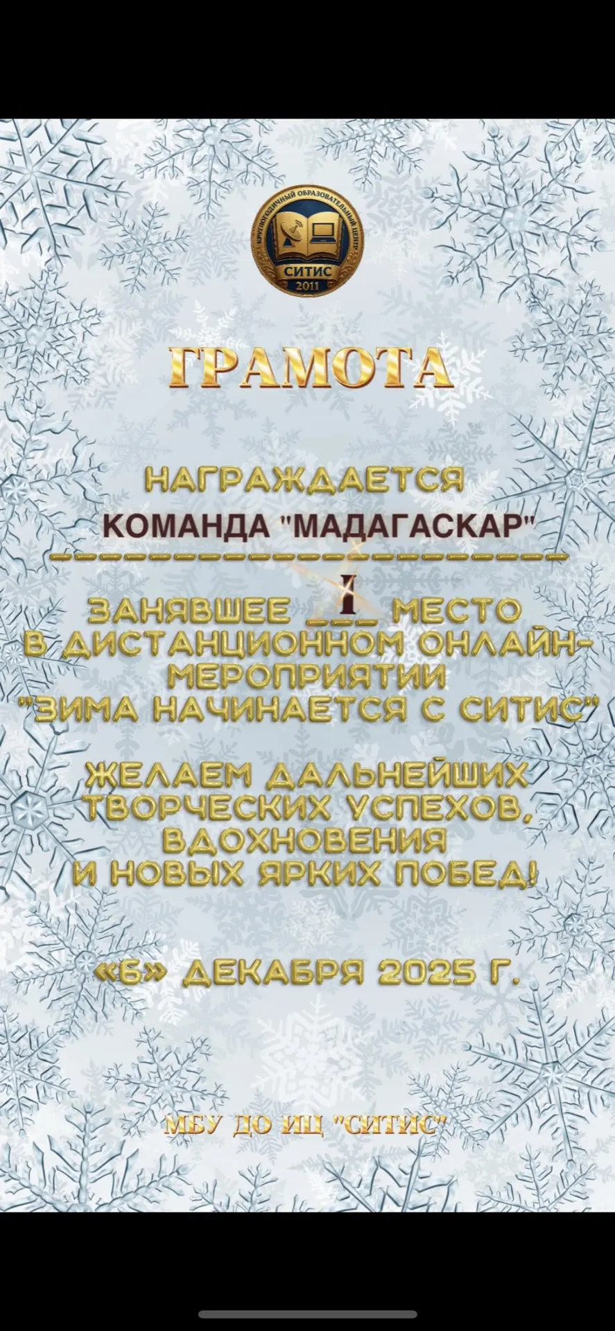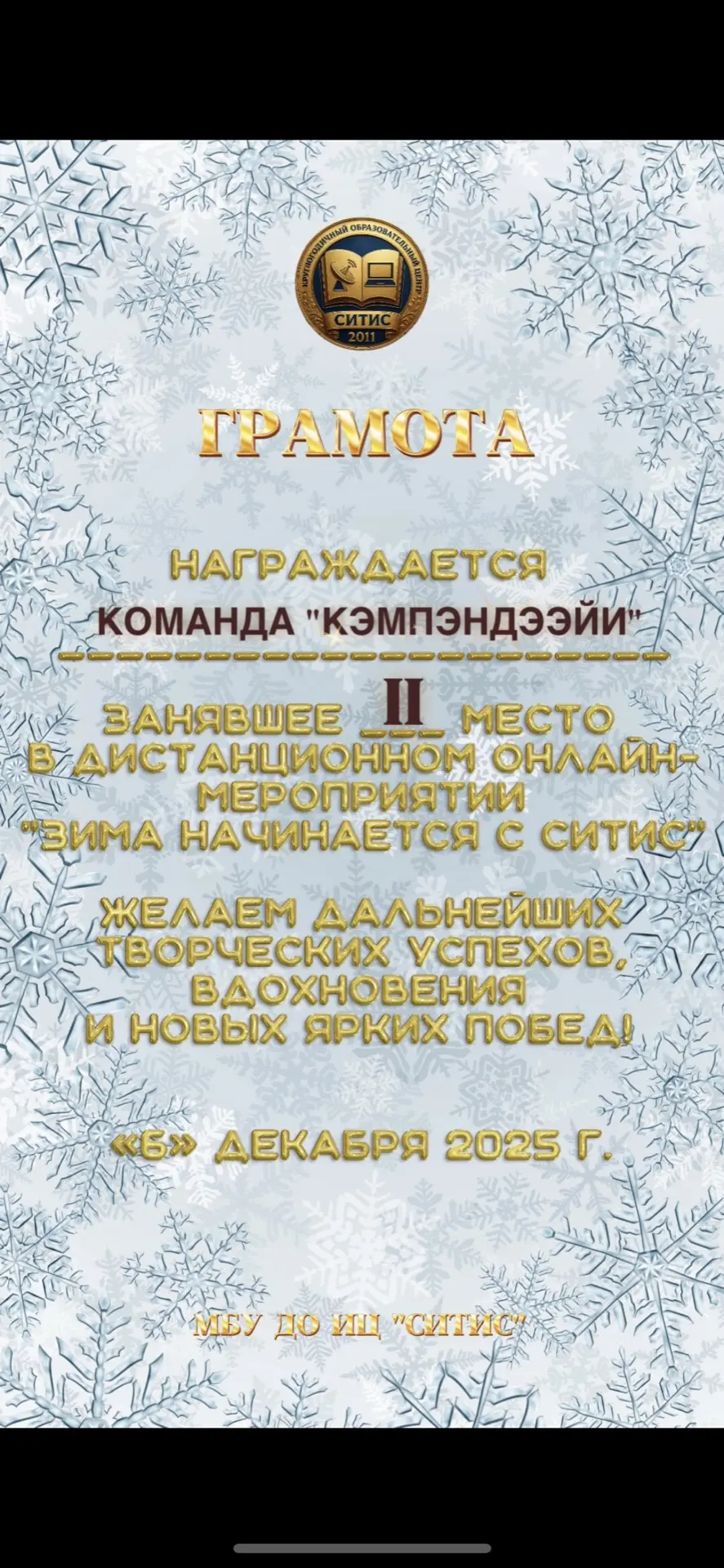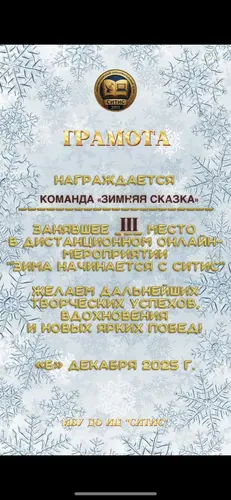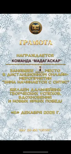 Мероприятие «Зима начинается с Ситис» прошло ярко и очень дружно: команды показали себя активными, творческими и организованными, а каждая работа по‑своему передавала зимнее настроение. Команда «Мадагаскар» уверенно стала лидером, продемонстрировав оригинальные идеи и слаженную командную работу. Команда «Кэмпэндээйи» заняла 2 место, впечатлив жюри продуманной подачей и аккуратным исполнением заданий. 3 место у команды «Зимняя сказка» – их выступление отличалось особой атмосферой уюта и волшебства. Команда «Сияние Ситис» заняла 4 место, но смогла по‑настоящему украсить мероприятие, добавив в общую копилку яркие эмоции и искренний настрой. В итоге онлайн‑встреча превратилась в настоящий зимний праздник, где каждый участник почувствовал свою значимость и причастность к общему успеху. | |